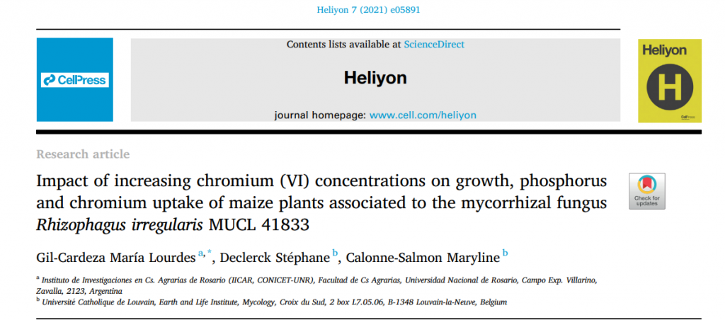 Artículo científico: Impact of increasing chromium (VI) concentrations on growth, phosphorus and chromium uptake of maize plants associated to the mycorrhizal fungus Rhizophagus irregularis MUCL 41833Por cravero / 2 junio, 2023 Artículo completo: Gil Cardeza et al 2021