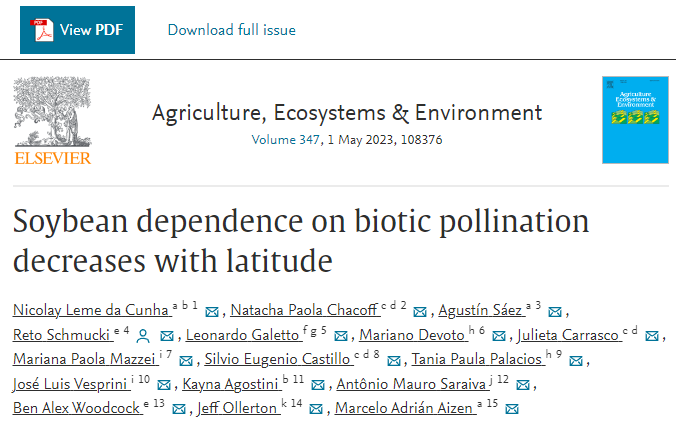 Artículo científico: Soybean dependence on biotic pollination decreases with latitudePor cravero / 2 junio, 2023 Artículo completo en : https://doi.org/10.1016/j.agee.2023.108376