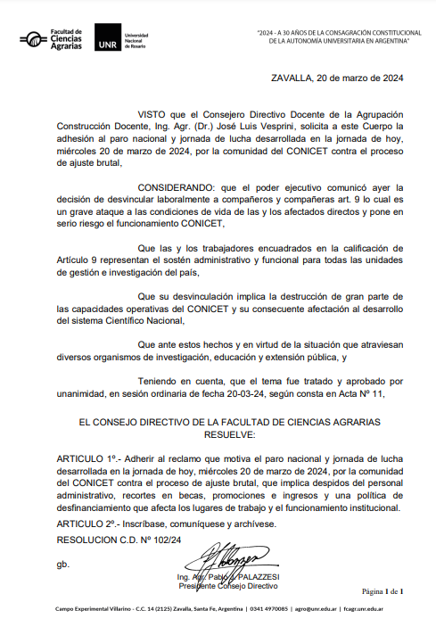 El Consejo Directivo de la Facultad de Ciencias Agrarias de la UNR, en la reunión ordinaria celebrada el día 20