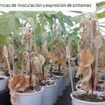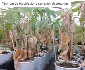 A partir de la colección fúngica obtenida desde 1997, conservada en el sector Fitopatología y Botánica Criptogámica del Laboratorio de Biodiversidad Vegetal y Microbiana (BioVyM) de la Fac. de Ciencias Agrarias e IICAR, se seleccionó una submuestra de aislamientos de Diaporthe phaseolorum varcaulivora–Dpc –obtenidos de diferentes cultivares de soja y agro-ecosistemas del centro-sur de Santa Fe y norte-centro de Buenos Aires para realizar diversos estudios de patogenicidad. Los aislamientos fueron identificados morfológica y molecularmente y validados periódicamente (Pioli et al., 2003; 2009; Peruzzo-Pioli, 2010; Hernández et al., 2015; Pioli, 2016; Grupo Fitopatología, 2018). En base a los valores de severidad promedio causado por cada aislamiento de Dpc evaluados en numerosos estudios previos de interacción planta-patógeno, se seleccionaron cuatro cepas de Dpc para ser probadas periódicamente en invernadero. Finalmente las poblaciones segregantes F3, completas y ordenadas en familias (F2:3) (Pruebas de Progenie) y F2 complementarias se inocularon con aquel aislamiento Dpc capaz de diferenciar de manera más contundente el comportamiento de resistencia o susceptibilidad de los genotipos progenitores. Las inoculaciones se realizaron de acuerdo al protocolo de Pioli et al. (2003), Chiesa et al. (2009), Benavídez et al., 2010; López Achaval et al. (2014) y Peruzzo et al. (2017).