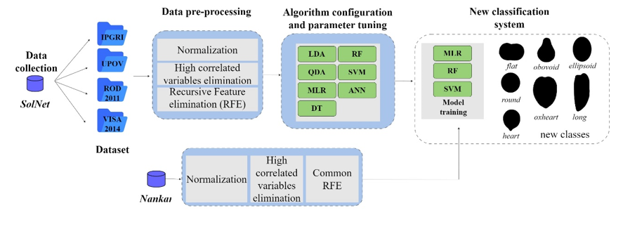 Para dicho desarrollo se utilizaron dos conjuntos de datos independientes: SolNet y Nankar. SolNet es un conjunto de datos extraído desde repositorios públicos, mientas que Nankar es producto de la investigación del grupo colaborador. La metodología desarrollada contempla los cuatro sistemas de clasificación para la forma del fruto presentes en al actualidad y siete modelos de clasificación automática como: LDA (Análisis Discriminante Lineal); QDA (Análisis Discriminante Cuadrático); MLR (Regresión Logística Multinomial); DT (Árboles De Decisión); RF (Bosque Aleatorios); SVM (Máquinas de Soporte Vectorial) y ANN (Redes Neuronales Artificiales).