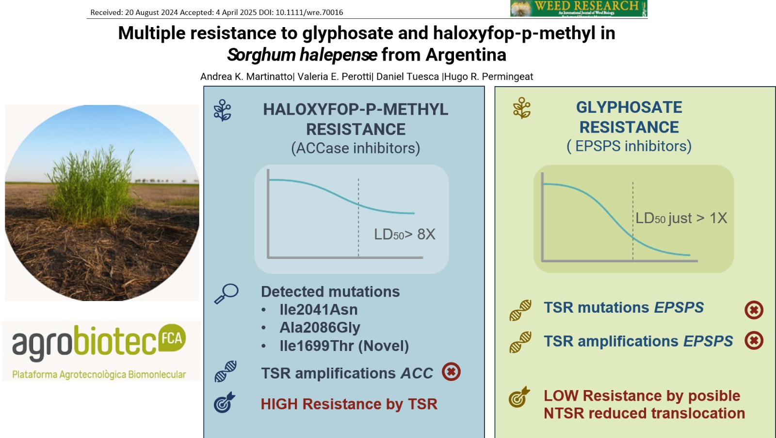 Este artículo describe la resistencia múltiple que desarrolló una población de sorgo de Alepo en la provincia de Santa Fe a dos modos de acción de herbicidas: glifosato y haloxyfop-p-methil. En el mismo se dilucidaron los mecanismos moleculares de la resistencia, determinando que la resistencia a inhibidores ACCasa responde a mutaciones de punto en la enzima blanco del herbicida (3 mutaciones en una región conservada de la misma, 2 de ellas previamente informadas; mientras que una tercera mutación fue identificada como novedad en este artículo). En el caso de la resistencia a glifosato, el mecanismo obedece a un mecanismo no asociado al sitio de acción del herbicida.