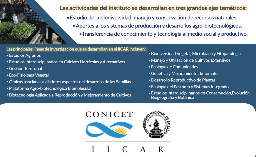 En el marco de la maratón que organiza la Facultad de Ciencias Agrarias en el Campo Experimental Villarino, Zavalla, se realizará una jornada de puertas abiertas del Instituto de Investigaciones en Ciencias Agrarias Rosario (IICAR)-CONICET de 09:00 a 13:00 hs. El objetivo es la difusión, interacción y comunicación con la comunidad sobre conocimiento científico y tecnológico en el área de las Ciencias Agrarias. Investigadores del CONICET- IICAR-UNR realizarán muestras de sus líneas de trabajo.