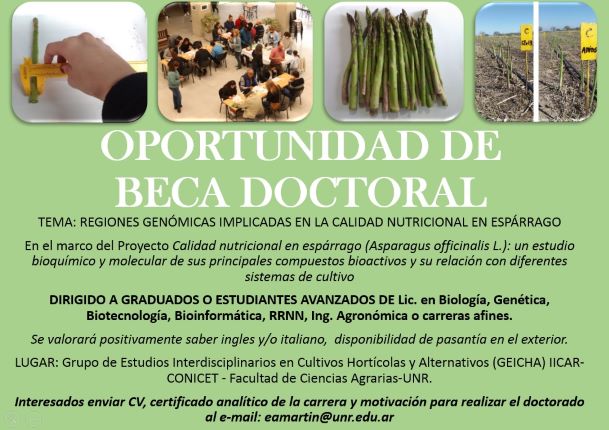 Beca Doctoral de 3 años de duración, en el marco del proyecto PICT-2021 «Calidad nutricional en espárrago (Asparagus officinalis L.): un estudio bioquímico y molecular de sus principales compuestos bioactivos y su relación con diferentes sistemas de cultivo».